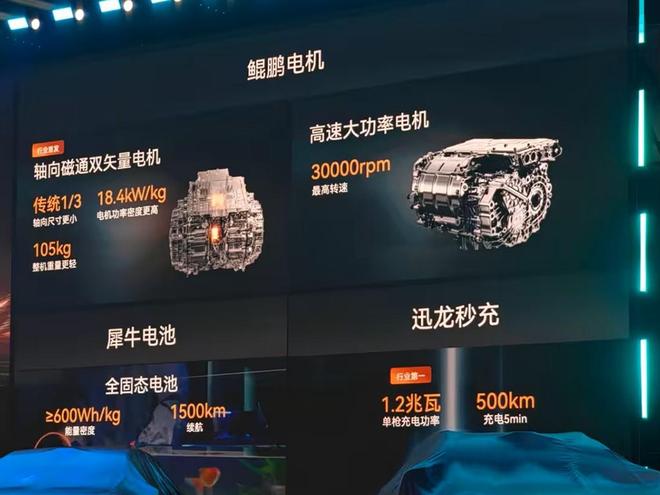 首先是30000转的电机。按照官方说法,这个电机的全称是轴向磁通双矢量电机,其轴向尺寸比传统电机小1/3,重量也更轻,只有105kg。另外, 这台电机的功率密度更高,可以达到18.4KW/kg,也正因为如此,这套高速大功率电机的最高转速才能达到惊人的30000rpm。