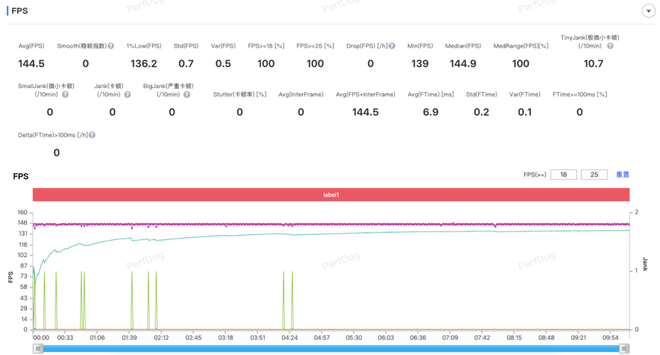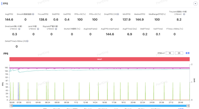 《王者荣耀》支持高清画质+144帧模式,画面细节和流畅度都没落下,整局游戏帧率曲线非常稳定.
