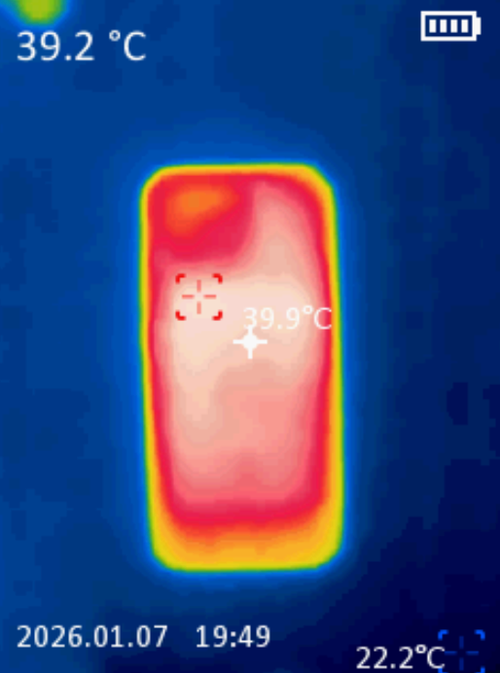 机身温度39.9℃,冰穹双网散热系统的 超大VC均热板配合双层超高导热石墨层 带来的散热效果还是非常明显的,长时间游戏后机身温度控制出色,没有烫手感,确保性能持续稳定输出。