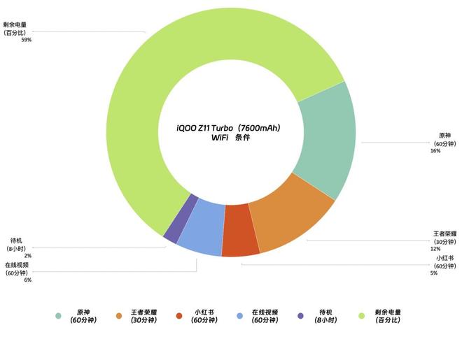 在续航方面,iQOO Z11 Turbo 在 6.59 英寸中屏尺寸的机身内,塞入了甚至超越不少大屏旗舰机型的电池容量,搭载了 7600mAh 超大容量的超薄蓝海电池。得益于先进的电池结构设计与出色的能效管理,在日常高强度使用下也能提供充足的电量保障,天极网实测的续航表现如下: