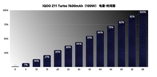 充电方面,iQOO Z11 Turbo 最高支持 100W 有线快充,可根据不同使用场景与机身温度智能调节充电电流,在保证速度的同时兼顾安全与电池寿命。实测显示,有线充电约 30 分钟即可充至约 44%,从零到完全充满总耗时约 58 分钟,实测的充电数据如下: