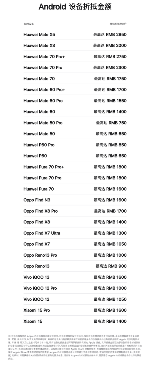 而这次政策升级的最大亮点,当属安卓机型折抵清单的大幅扩容,华为、小米的热门旗舰都被纳入其中,安卓用户想换苹果终于不用愁旧机变现了。华为阵营里,折叠屏旗舰 Mate X5 最高能抵 2850 元;Mate 70 Pro+ 和 Mate 70 Pro 分别能抵 2750 元和 2300 元;Pura 70 系列也有不错的报价,Pura 70 Pro+ 和 Pura 70 Pro 均为 1800 元,Pura 70 则是 1600 元。小米这边,小米 15 Pro 和 小米 15 分别能抵 1600 元和 1400 元。除此之外,OPPO Find X8 Pro、vivo iQOO 13 等机型也同步加入折抵名单,最高折抵价分别达到 1700 元和 1600 元,从折叠屏到影像旗舰再到中端主力机,覆盖面直接拉满。
