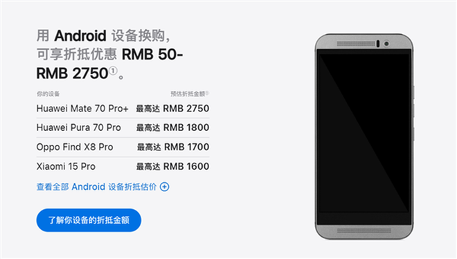 苹果中国近期悄悄更新了 Apple Trade In 以旧换新计划,不仅对 iPhone、iPad、Mac 等自有设备的折抵价做了精细化调整,还大手一挥把华为、小米等一众安卓主流机型的覆盖清单扩了个遍,连线上估价和服务衔接流程都一并优化,这波操作直接把跨品牌换购的门槛给拉低了。