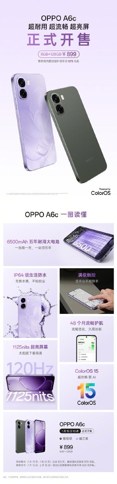 目前,OPPO A6c 提供 幽兰紫 与 橄榄绿 两款配色选择,官方售价 899 元,首发到手价仅 799 元,叠加国补入手价679元。