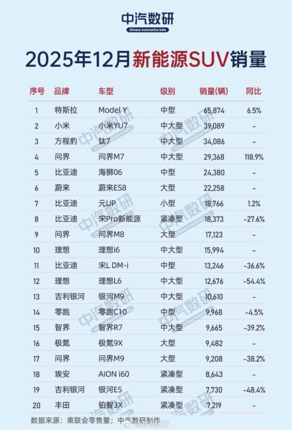 数据显示,特斯拉Model Y以65874辆的零售销量继续领跑榜单,同比增长6.5%,稳居月度销量冠军。小米汽车旗下首款SUV车型YU7上市后表现强劲,以39089辆的成绩夺得亚军。方程豹品牌推出的钛7车型以34086辆位列第三,进一步丰富了中大型电动SUV的市场选择。