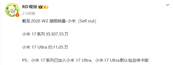 1月18日,数码博主“RD观测”称,截至2026年第2周,小米17系列销量达约307.55万台。其中,17 Ultra销量约为11.05万台。