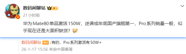 1月18日,知名数码博主“数码闲聊站”披露,华为Mate 80单品激活量已突破150万台,成功逆袭,夺得国产旗舰手机单品销量冠军。与此同时,定位更高端的Mate 80 Pro系列激活量也已突破50万台。