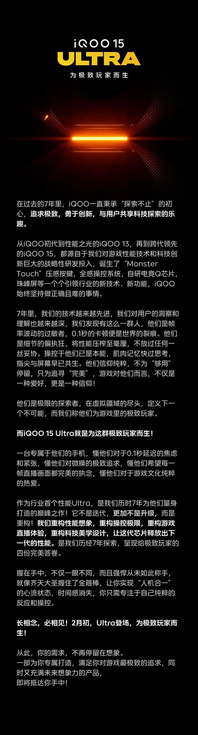 春节前换机必看!打破行业惯例,iQOO在2026年首款性能旗舰——iQOO 15 Ultra近日官宣2月初亮相,现已开启全平台预约。这款历时 7 年打造的巅峰之作,不再是简单迭代升级,而是彻底重构性能旗舰的核心逻辑,专为追求极致体验的玩家量身定制。
