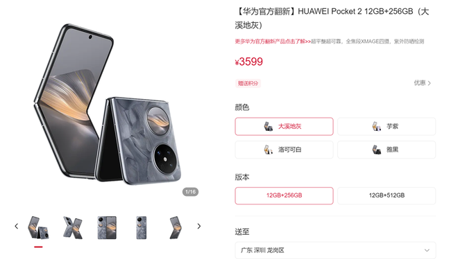 华为Pocket 2的小折叠手机官翻版近日在官网上架,起售价为3599元,其最初的上市价格为7499元。华为官翻版手机为100%官方正品,主要以7天无理由退货的机器为主,外观成色达到99新标准,并且提供官方售后服务,保障一年质保。