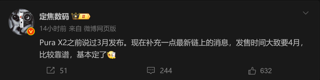 华为Pura X阔折叠二代预计将在3月正式发布,发售时间基本确定在4月份。这款新机将延续前代的设计理念,命名为Pura X2,依然采用“矮胖”的阔折叠形式,但内屏尺寸有望增大至7.6-8英寸,从而实现更大的显示面积,成为一款真正的阔比例大折叠手机。