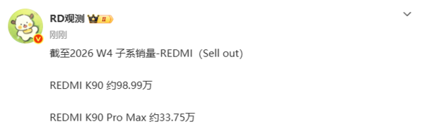 2月3日,数码博主“RD观测”公布了截至2026年第四周红米REDMI K90系列的销量成绩。数据显示,K90累计销量约为98.99万台,K90 Pro Max累计销量约为33.75万台。