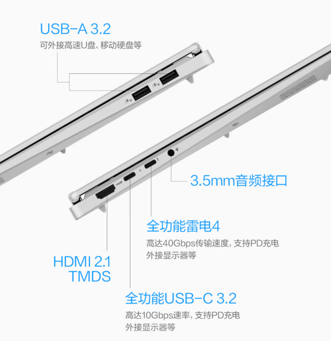 它提供了2个USB-A 3.2接口、1个全功能USB-C 3.2接口(10Gbps速率,支持PD充电、外接显示器)、1个全功能雷电4(40Gbps速率,支持PD充电、外接显示器)、HDMI 2.1 TMDS接口以及3.5mm音频接口,满足用户外接U盘或硬盘传输数据、连接键鼠等外设、扩展多块显示屏等需求。