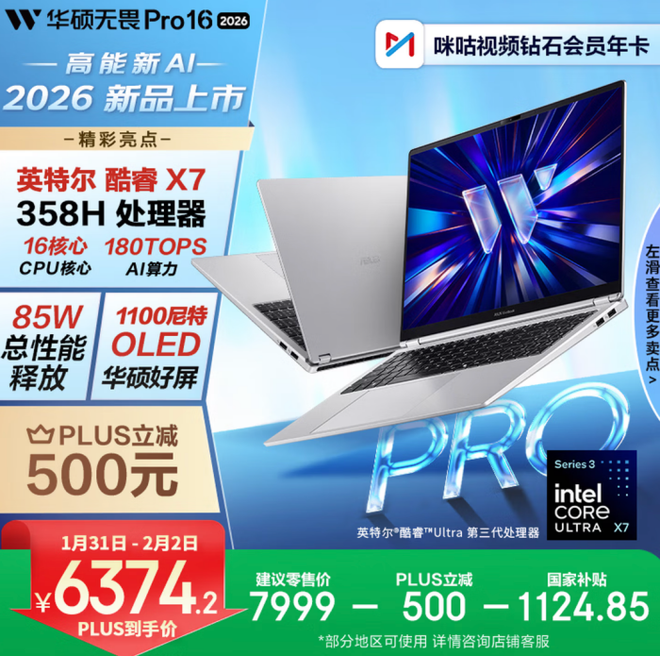 华硕无畏Pro16 2026酷睿Ultra X7 358H版本售价为7999元,京东Plus会员可享500元优惠券,部分地区可享受国补(详情咨询客服)。另外还有酷睿Ultra 7 356H版本可选;华硕无畏Pro14 2026酷睿版售价为6999元,Plus会员可享500元优惠券,大家可以根据需求进行选购。