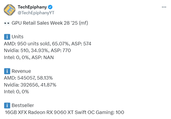 统计数据显示,在今年第28周,AMD显卡的销量占比达到了65.07%,共售出950块显卡,而NVIDIA显卡的销量占比为34.93%,售出510块。