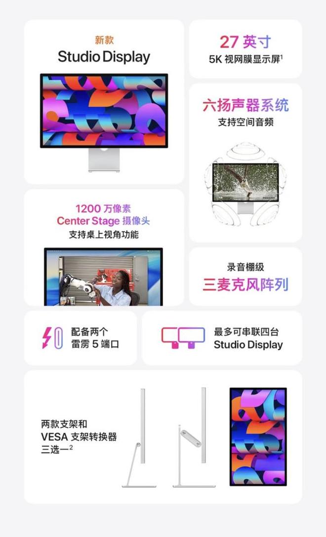 配备1200万像素Center Stage摄像头,升级的六扬声器系统,配备四个振动抵消低音单元,两个高性能高音单元带来精准的中音和透亮的高音,支持空间音频,提升沉浸感。拥有两个雷电5接口,两个USB-C接口,最多能串联四台Studio Display显示器,还能外接硬盘或是为iPhone充电。标配可调倾斜度的支架,选配可调倾斜度及高度的支架和VESA支架转换器。