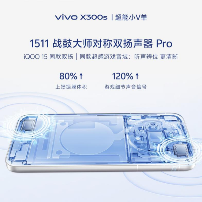 此外,X300s还搭载1511战鼓大师对称双扬声器Pro,iQOO 15同款对称双扬,上下双大腔体配合新一代功放和算法,音效更加震撼。同时,配备iQOO 15同款超感游戏音域,游戏细节声音信号直接提升120%。