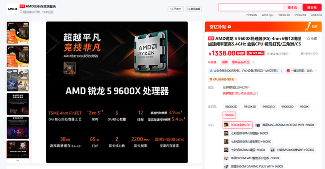 目前AMD 锐龙5 9600X处理器在在京东自营旗舰店的报价是1459元,京东PLUS会员到手只要1338元,成为AMD京东自营旗舰店会员还有0元入会抽100元E卡,首购返666京豆和晒单抽AMD定制鼠标等活动。