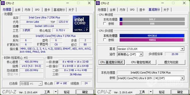 在CPU-Z(版本V2.19)的测试中,Ultra 7 270K Plus的单核得分911.7,多核得分19138.6,这个成绩表现非常出色,对比CPU-Z内置的上代旗舰Ultra 9 285K的成绩都有着微弱的领先;而对比上代的Ultra 7 265K则是提升明显,单核提升7%,多核提升则是达到了28%。