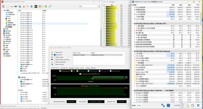经过了15分钟的拷机测试后,此时Ultra 7 270K Plus的CPU封装平均温度为85°C,此时CPU功耗最高可达277瓦,平均功耗249.87瓦。同时在频率上,Ultra 7 270K Plus的性能核始终稳定在5.0GHz以上,能效核稳定在4.5GHz以上,频率也是相当稳定。整体来看,Ultra 7 270K Plus的功耗设定比起上代奔放了不少,当然性能也带来了明显的提升。