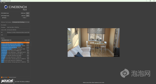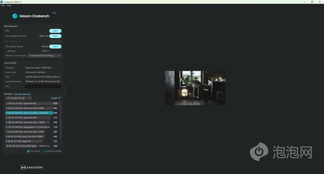 在软硬件双升级的情况下,全新的Ultra 7 270K Plus在基准性能上表现如何呢。(*以下测试结果均在BIOS默认设定、开启内存XMP超频的情况下测得,测试结果仅代表泡泡网实验室环境下当前硬件配置与软件版本下的成绩)