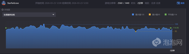 而在功耗方面,我们也在实际运行性能要求不低的《星空》时进行了记录,在记录的时间段当中平均功耗为115W,整体还是比较节能的,长时间游戏也不会出现过热降频的情况。