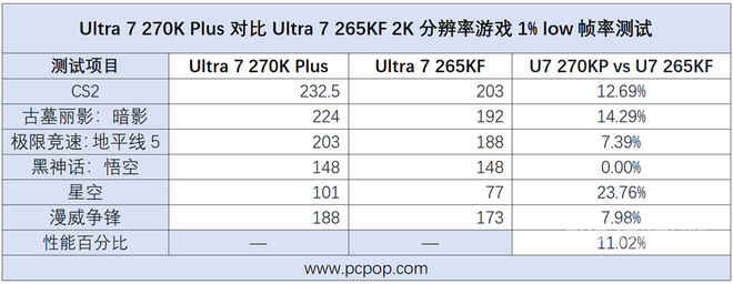 而在对于游戏体验同样关键的1% low帧指标当中,Ultra 7 270K Plus对比上代Ultra 7 265KF的领先与平均帧上的表现基本一致。整体对比上代的领先幅度还是非常不错的,在游戏中可以提供更加流畅不卡顿的体验。