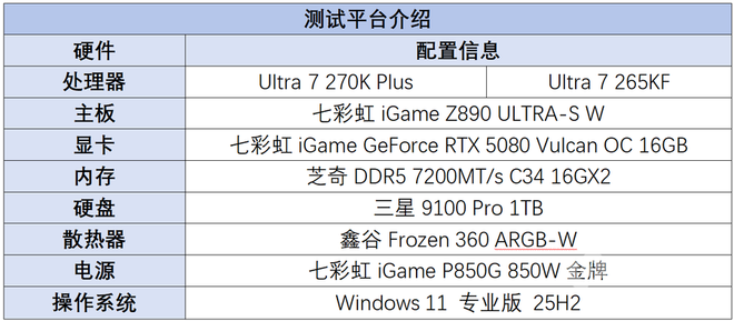 显卡方面,我们则是搭配了七彩虹的iGame GeForce RTX 5080 Vulcan OC 16GB火神显卡,出众的性能表现延续了系列硬核基因的外观,以更具攻击性的夸张赛博朋克机甲风为核心设计,细腻磨砂喷漆搭配亮银色镀铬装饰勾勒出未来机械装甲般的硬朗造型,3槽的超大尺寸机身配合标志性的可玩LCD智屏,带来了极具炸裂感的视觉冲击力与未来科技感。测试平台的其他配置可以详见下表。
