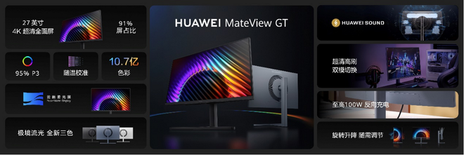 全新一代华为MateView GT显示器也在此次发布会上正式发布。HUAWEI MateView GT 27英寸超清版Sound款搭载4K云晰柔光屏,拥有91%超高屏占比,最高支持320Hz的高刷新率,覆盖95% P3广色域及100% sRGB色域,可呈现10.7亿色的生动画面;其作为华为目前尺寸最大的云晰柔光屏产品,具备抗眩光、抗反射及抗指纹性能,有效降低环境干扰光,贴心呵护双眼。