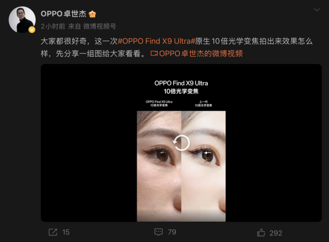 据OPPO Find系列产品前负责人刘作虎通过微博介绍,在手机长焦的进化史上,从未有人真正将原生10倍光学变焦完美塞进轻薄的机身,传统手机要实现高倍率变焦,要么牺牲画质,要么导致机身厚重。而OPPO Find X9 Ultra通过技术创新,将这一“不可能”变为现实,让用户无需额外携带增距镜配件,仅凭手机就能获得专业级远摄体验,通过微博展示了OPPO Find X9 Ultra 10倍光学变焦的效果与普通旗舰手机10倍数码变焦的效果。
