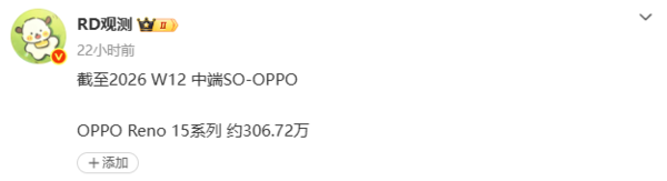 4月2日,数码博主“RD观测”公布了OPPO Reno15系列的最新销量数据。数据显示,截至2026年第12周,Reno15系列累计销量达306.72万台。