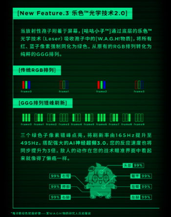 当放射性孢子附着于屏幕,[咕咕小子]通过底层的乐色光学技术吸收孢子中的[W.A.G.H!物质],即将红、蓝子像素同化为绿色,RGB排列变为纯粹的GGG排列,简单说就是彩屏变绿屏了。刷新率会从165Hz提升为495Hz,搭配强大的AI神经超频3.0,人的反应速度也将同步提升为3倍。