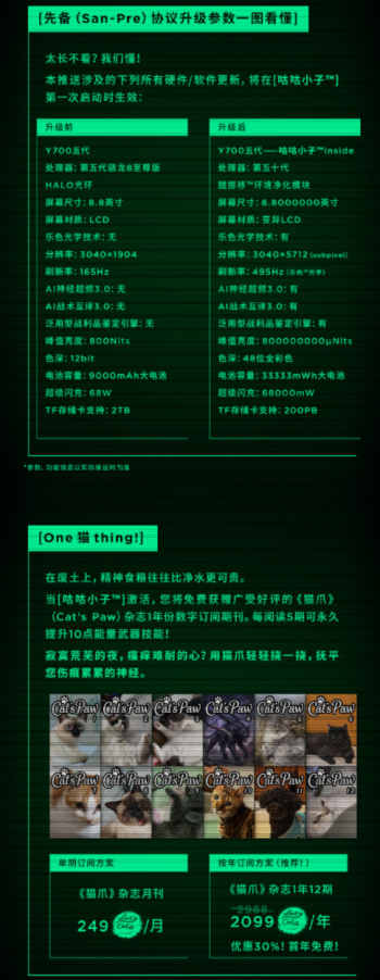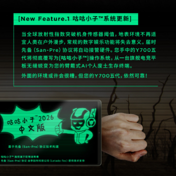 首先是咕咕小子系统更新,当地表环境不再适合户外漫步,常规的数字娱乐功能将没有意义,届时先备(San-Pre)协议会自动接管硬件,Y700五代会被覆写为[咕咕小子]操作系统,从电竞平板健身为臂戴式AI个人废土生存终端。