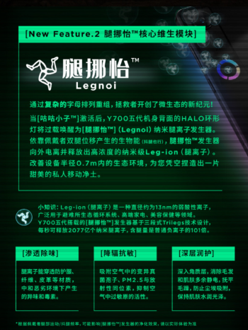 当[咕咕小子]激活后,Y700五代机身后面的HALO环形灯将过载唤醒为[腿挪怡](Legnoi)纳米腿例子发生器,依靠佩戴者双腿位移产生的生物能(抖腿也行),腿挪怡发生器向外电离并释放出高浓度的纳米级Leg-ion(腿离子),改善设备半径0.7m内的生态环境,捏造出一片私人移动净土。