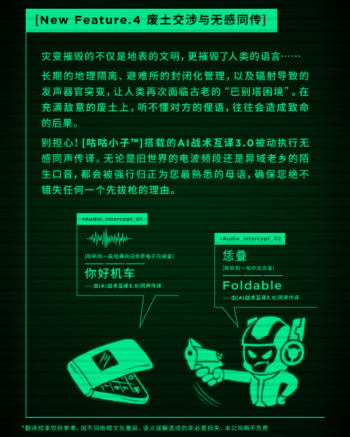 长期的地理隔离、避难所的封闭化管理,以及辐射导致的发声器官突变,让人类再次面临古老的“巴别塔困境”。而[咕咕小子]搭载了AI战术互译3.0被动执行无感同声传译,无论是旧世界的电波频段还是异域老乡的陌生口音,都会被强行归正为最熟悉的母语。