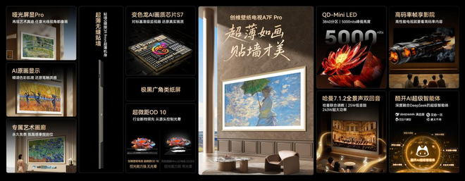 其中,A7F Pro系列拥有2304~5184分区控光,能够精准调节明暗细节,实现像素级精准控光,黑场纯粹,亮部有层次。其QD-Mini LED全链路AI控光系统,融合五大核心技术,包括双芯16晶芯片、光学超微透镜、超微OD、瞬时光色同控和双路24bit混合调光,确保每一个Mini LED灯珠控制精准,带来“高亮无光晕、极黑高对比、细节超清晰、色彩更真实”的卓越视觉体验,全面超越普通艺术电视。