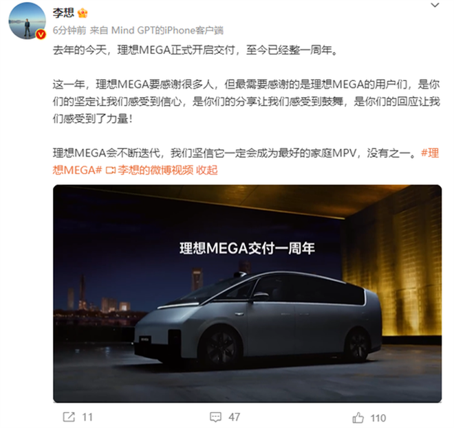 理想汽车创始人李想对理想MEGA寄予厚望,曾公开表示:“理想MEGA会不断迭代,我们坚信它一定会成为最好的家庭MPV,没有之一。”这一评价足以显现李想对这款车型的偏爱和信心。